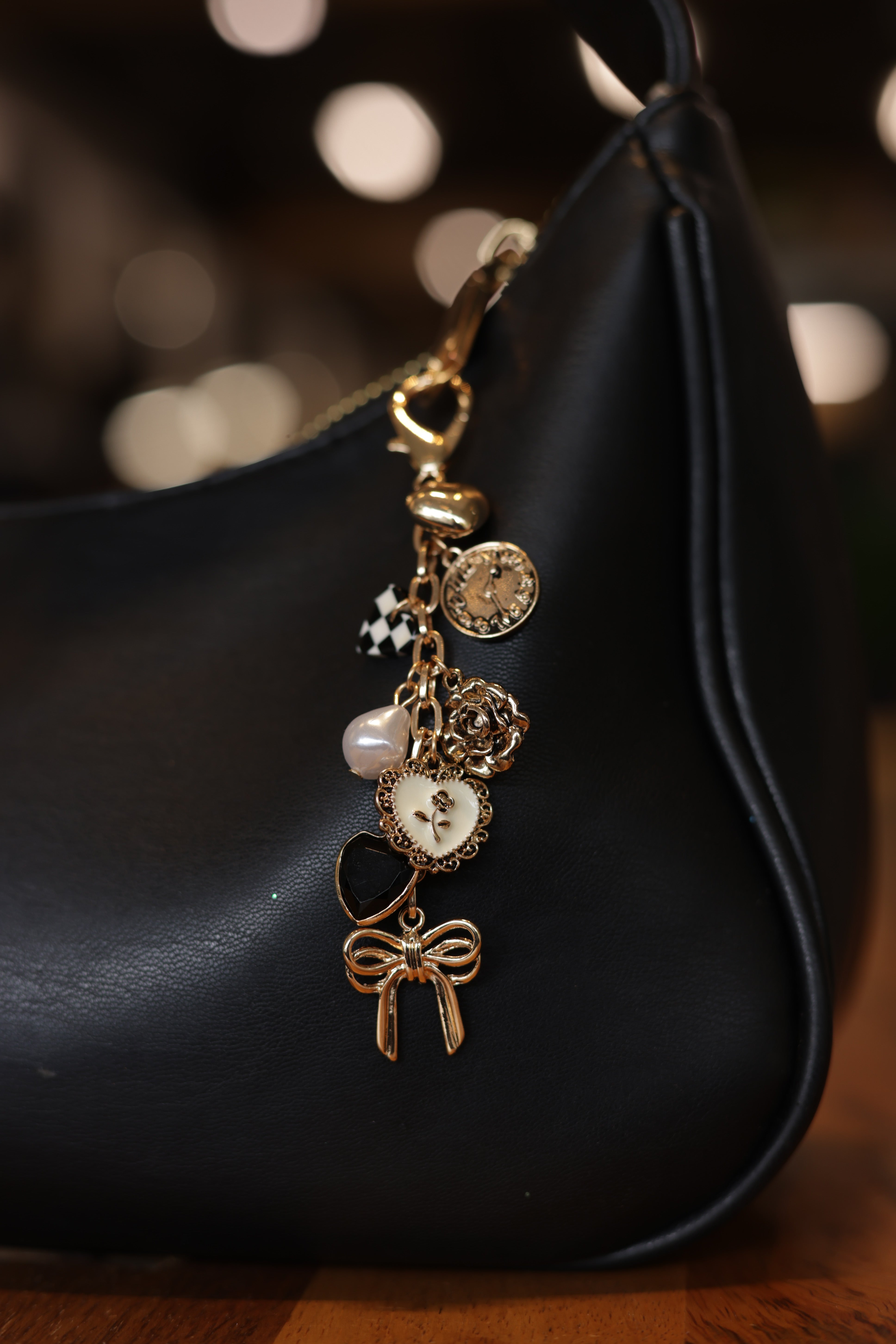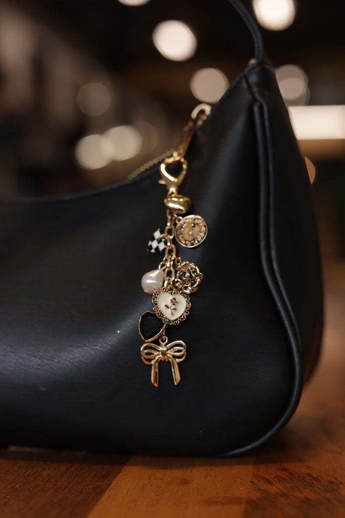 Add a touch of fun and charm to your keys or bag with the Blair Bag Charm Keychain. Featuring a playful checkered heart, a delicate flower, and a sweet bow—all accented in shiny gold—this accessory brings a cheerful pop of personality wherever you go. Perfect for brightening your essentials with a whimsical flair!