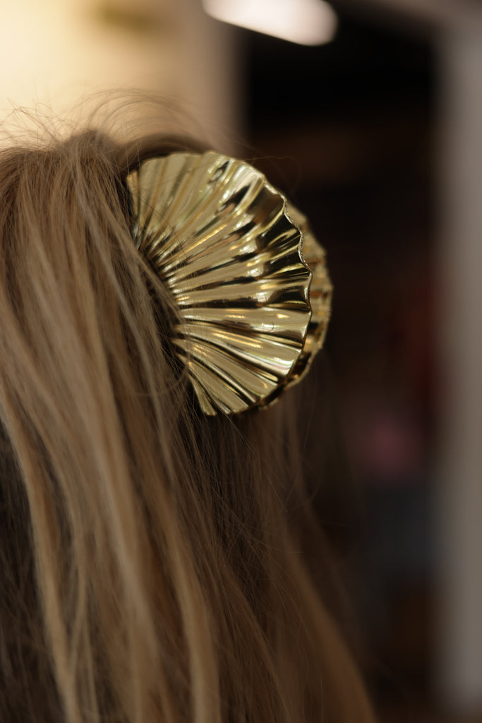 Add a touch of sunshine to your look with this gold Seashell Claw Clip. Its playful design not only keeps your hair neatly in place but also adds a splash of beachy chic to any outfit. Perfect for quick styling with a fun, fashionable flair.